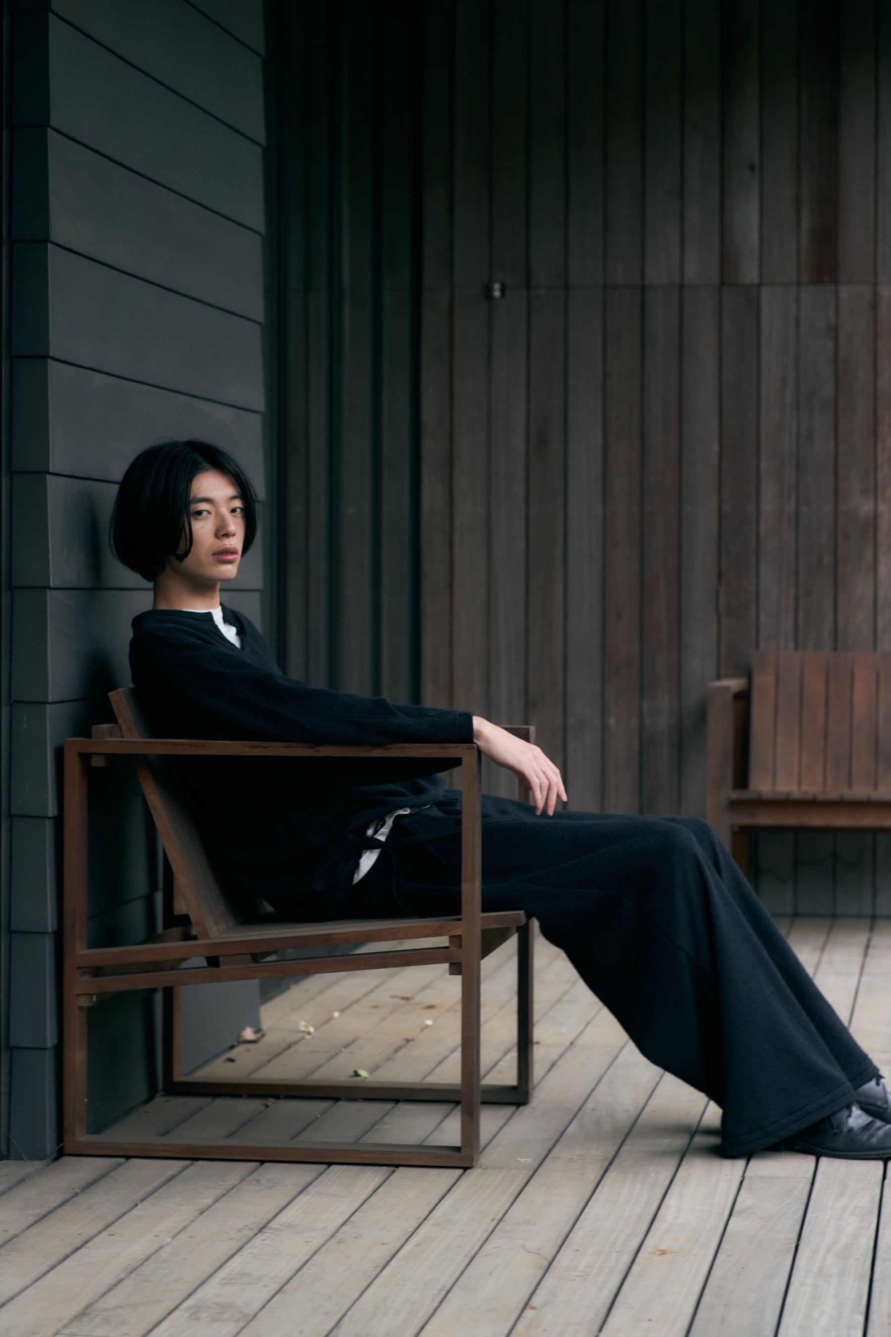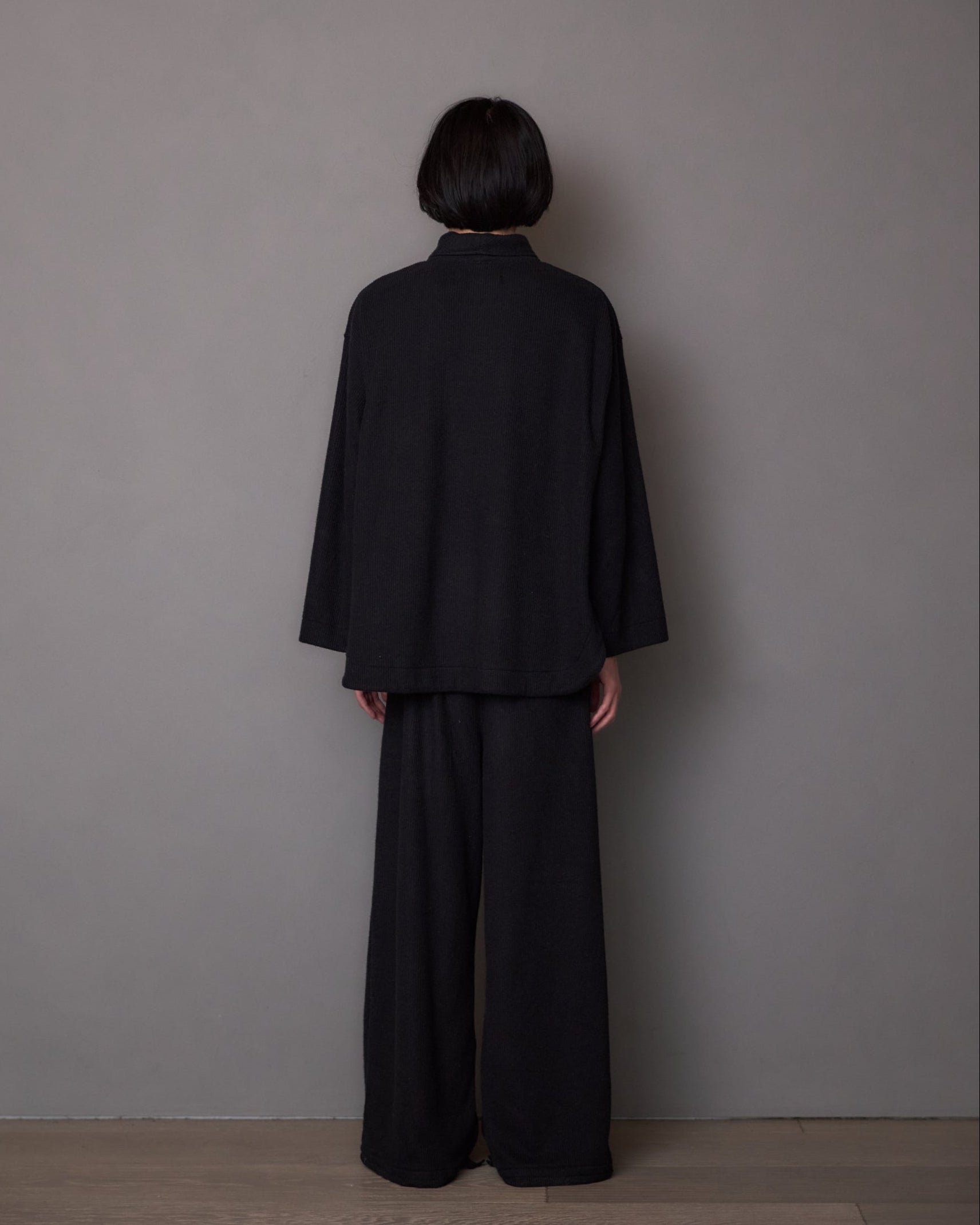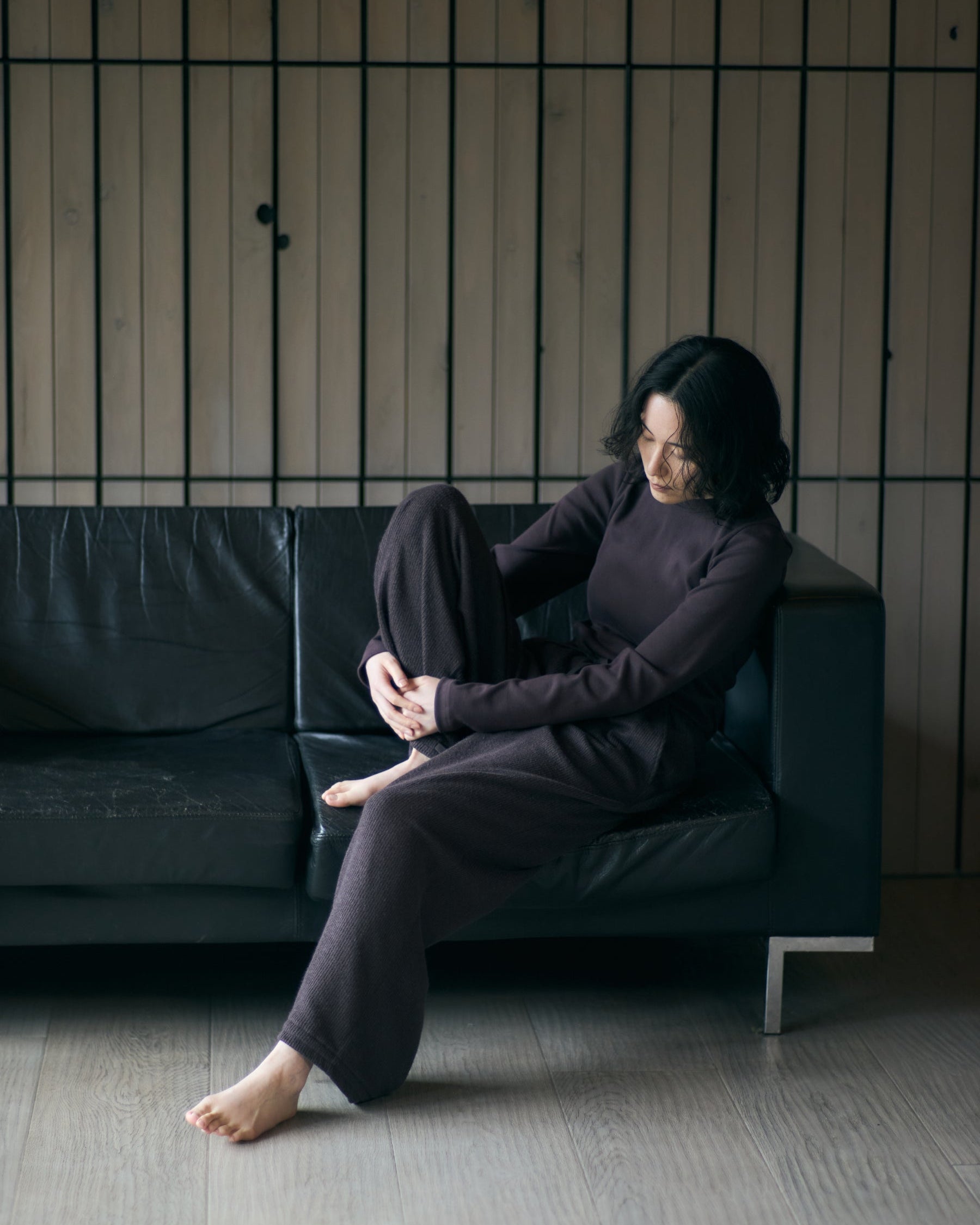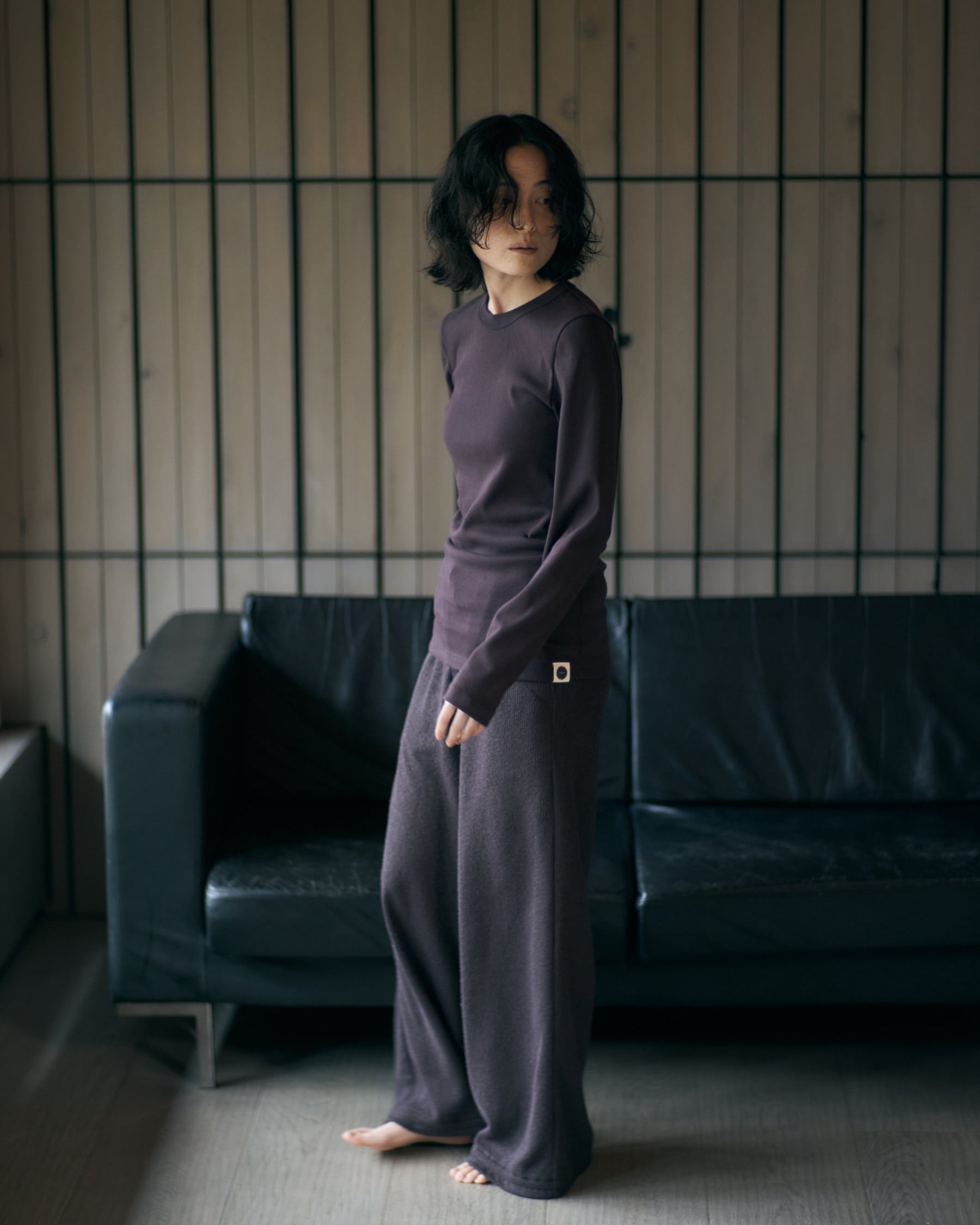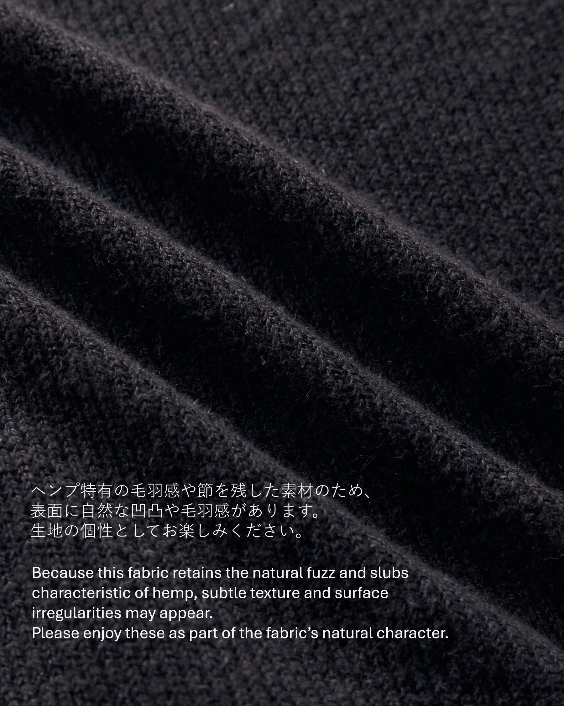 Knitted in Aichi, this ribbed jersey intentionally preserves the natural texture and subtle slubs characteristic of hemp, giving the surface depth and quiet individuality.The reverse side incorporates polylactic acid (PLA) yarn, supporting low-irritation comfort and a clean, breathable feel. Smooth to the touch with a soft, understated sheen, the rib construction provides flexible stretch that follows the body’s movement while maintaining its form—an ideal balance of character and everyday wearability.
