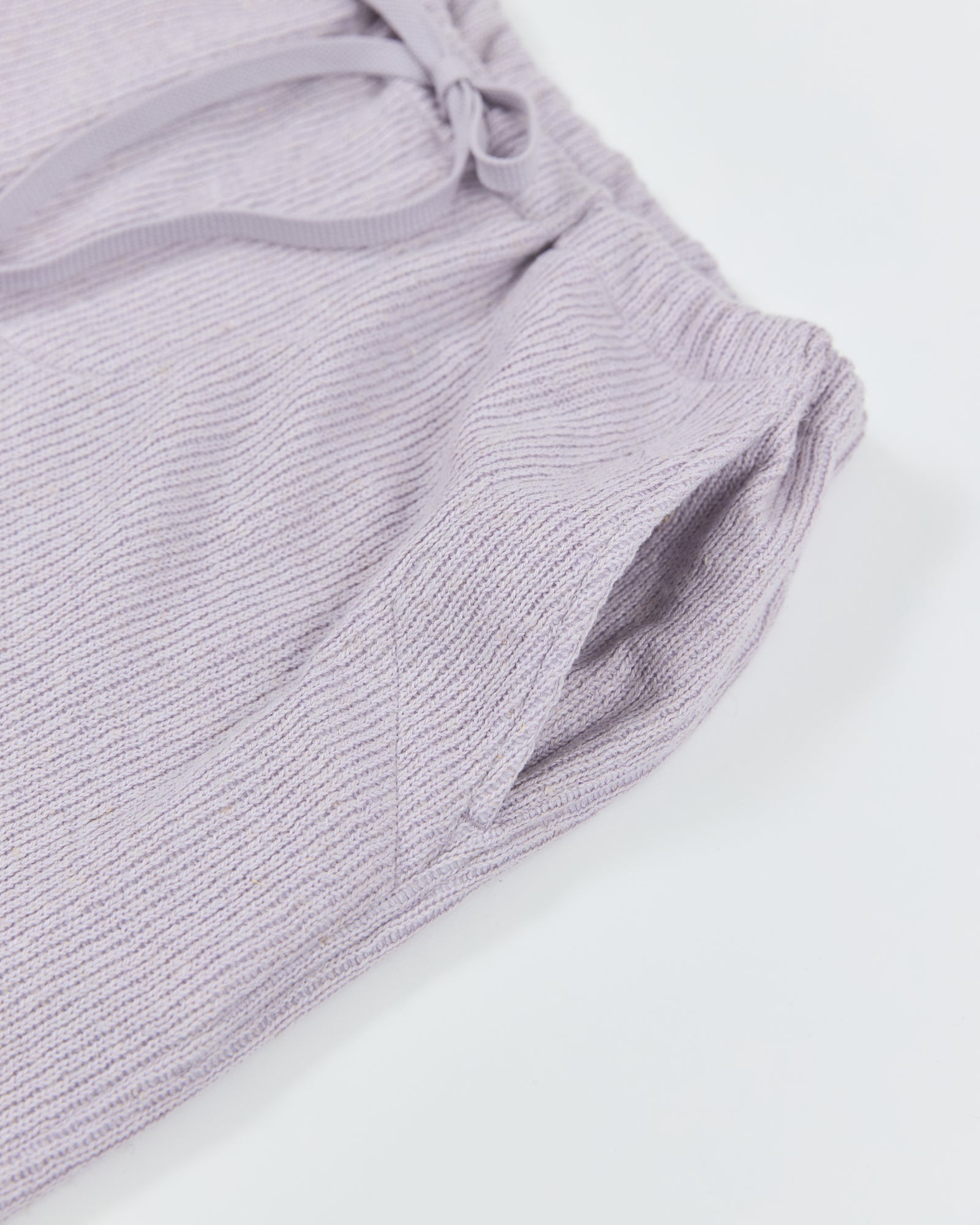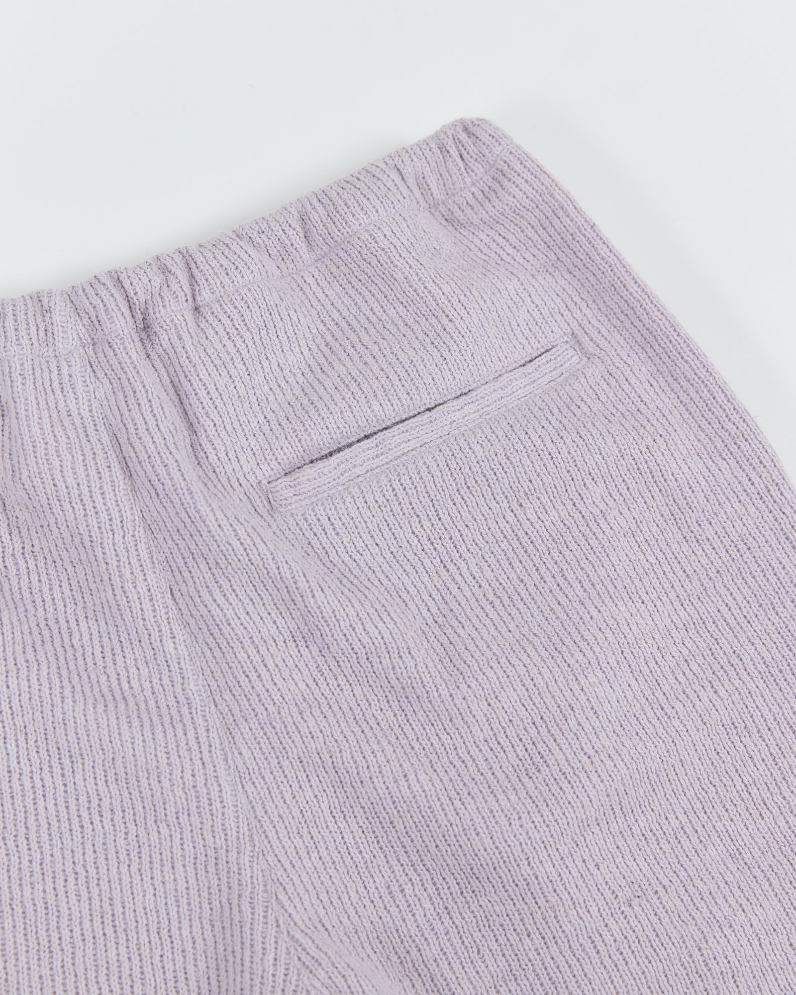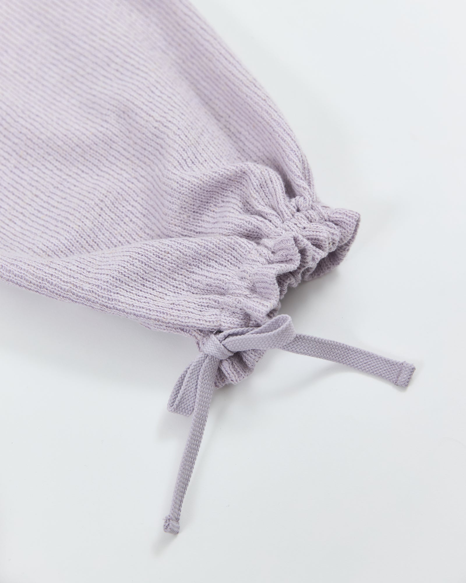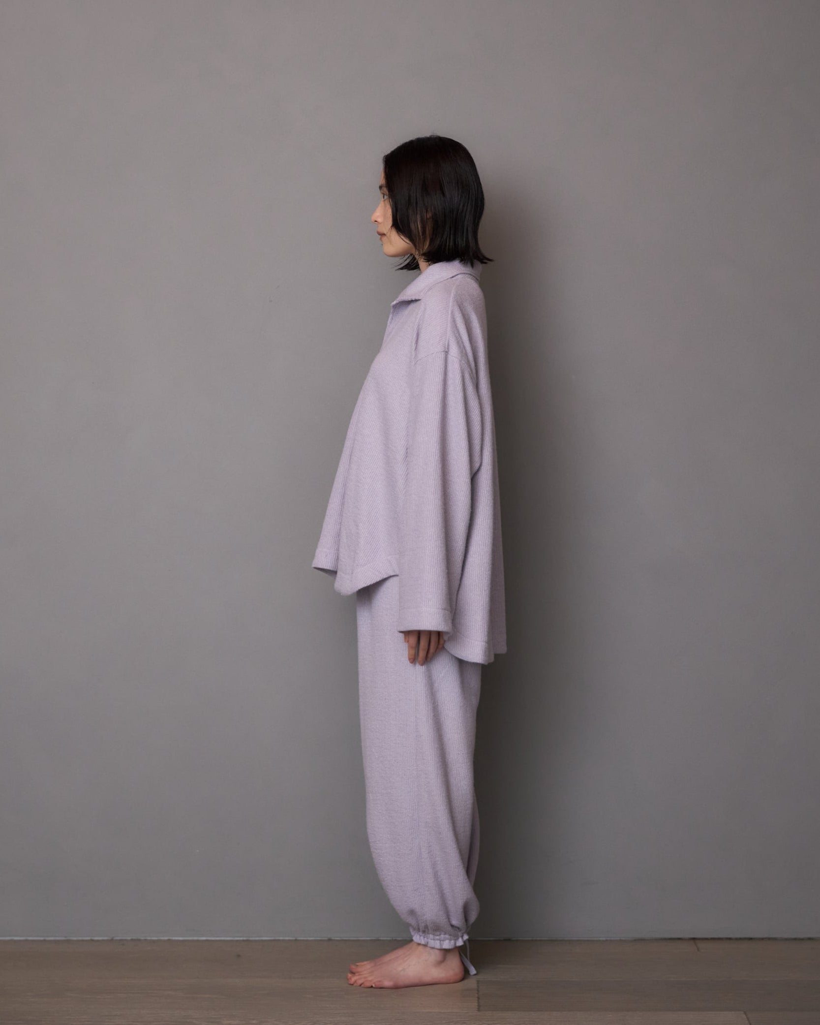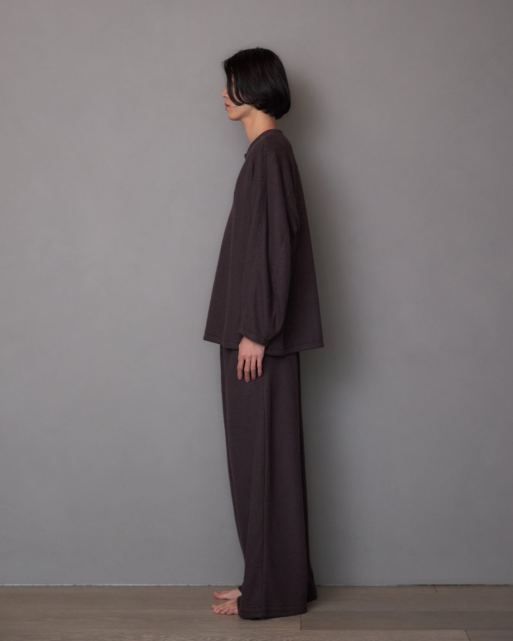 Knitted in Aichi, this ribbed jersey intentionally preserves the natural texture and subtle slubs characteristic of hemp, giving the surface depth and quiet individuality.The reverse side incorporates polylactic acid (PLA) yarn, supporting low-irritation comfort and a clean, breathable feel. Smooth to the touch with a soft, understated sheen, the rib construction provides flexible stretch that follows the body’s movement while maintaining its form—an ideal balance of character and everyday wearability.