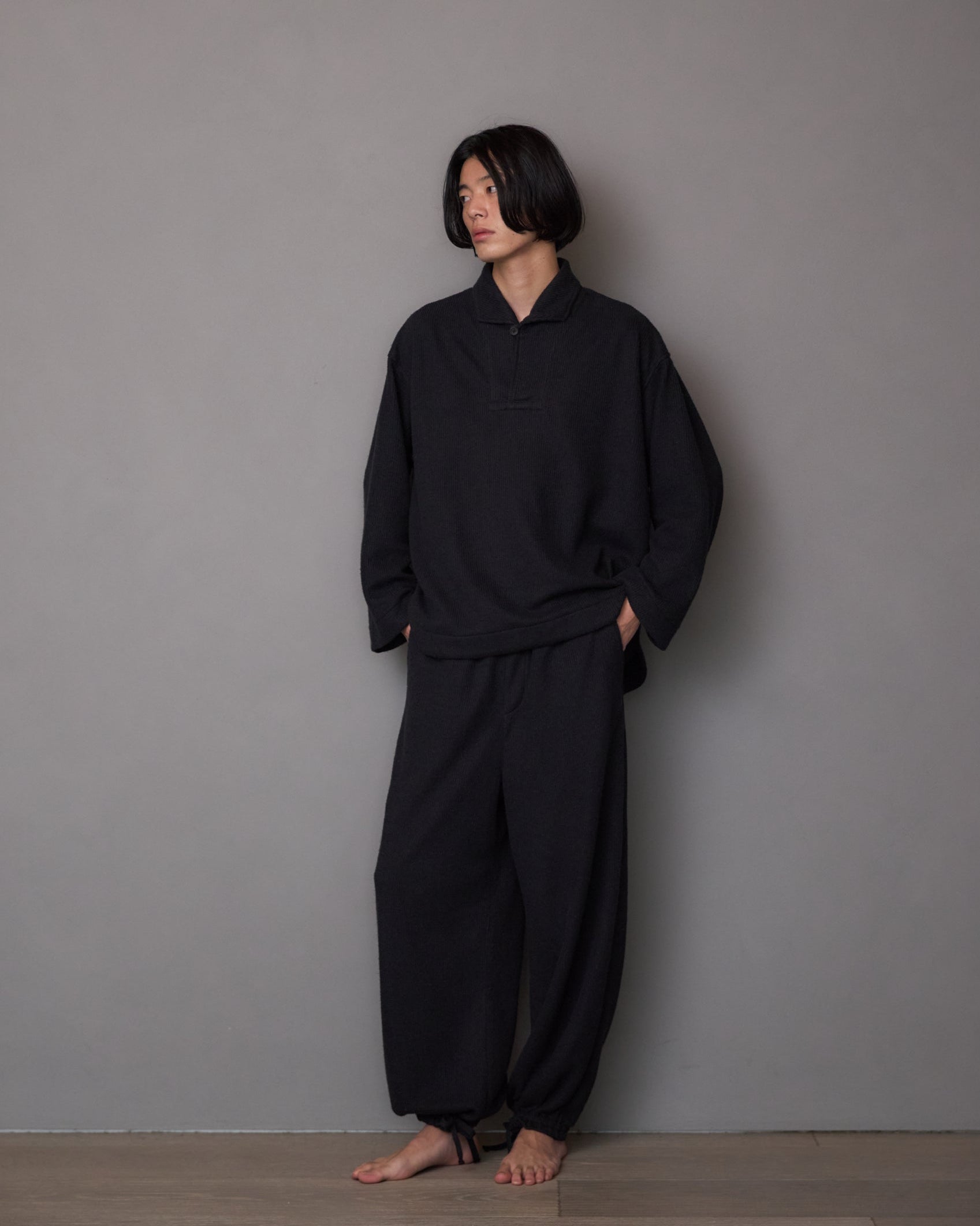 These full-length bottoms feature a wide, straight-leg silhouette.Designed to offer a relaxed feel while maintaining a clean, balanced look.An adjustable drawcord at the waist ensures easy comfort and a customizable fit. Subtle decorative stitching around the side pockets adds a refined accent to the minimalist design. A single welt pocket at the back keeps the look polished and prevents it from feeling overly casual. The hems are also finished with drawcords, allowing you to adjust the silhouette and add natural dimension and movement around the ankles. Wear them on their own or pair with ENSULO-051 or ENSULO-052 for a coordinated set-up style that delivers a cohesive, elevated casual look.