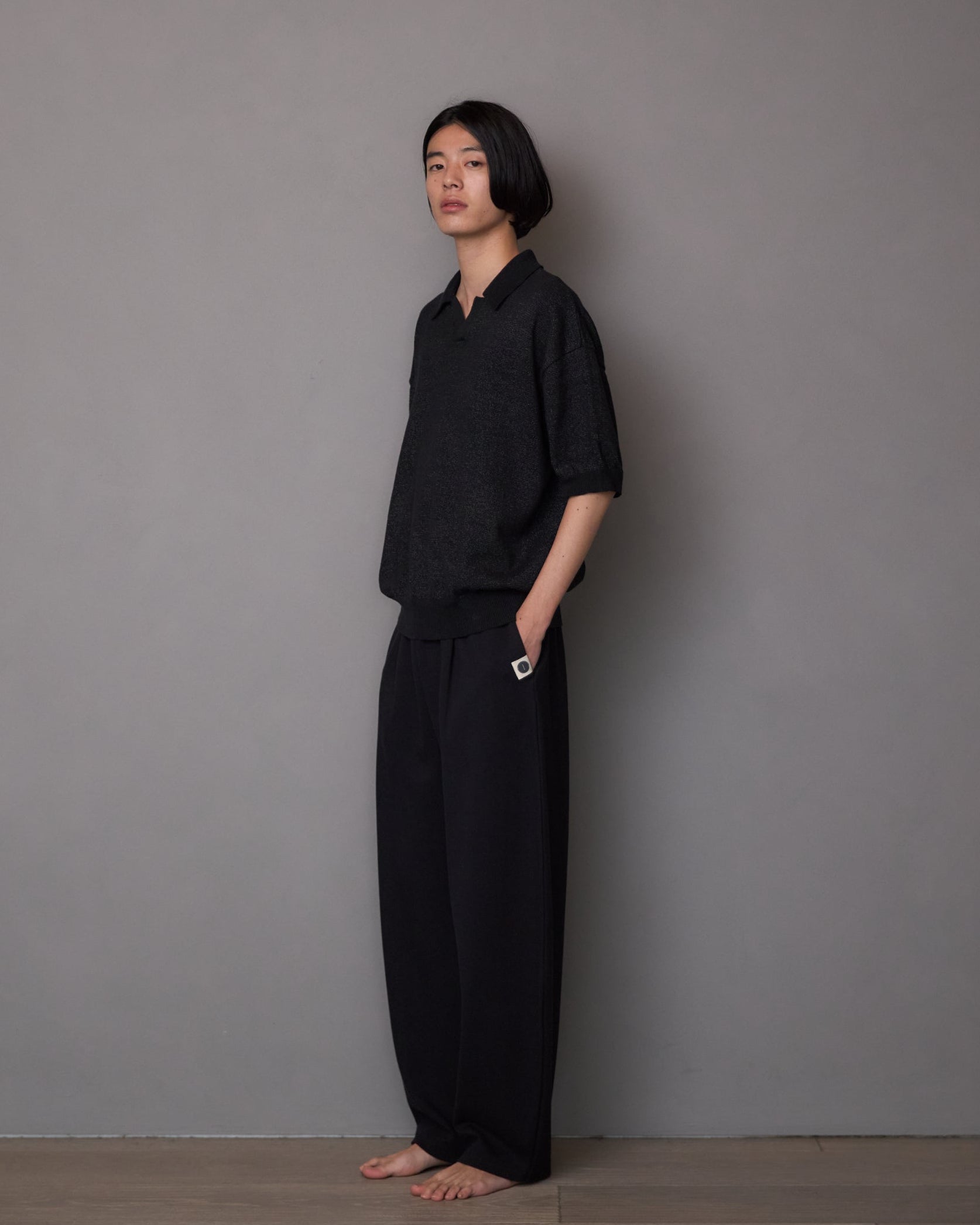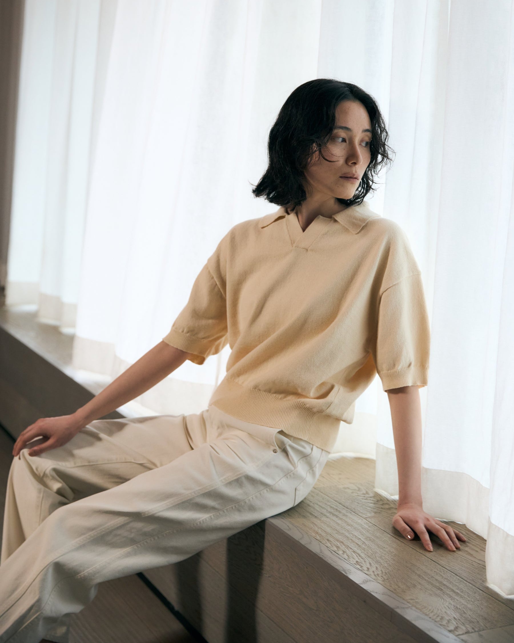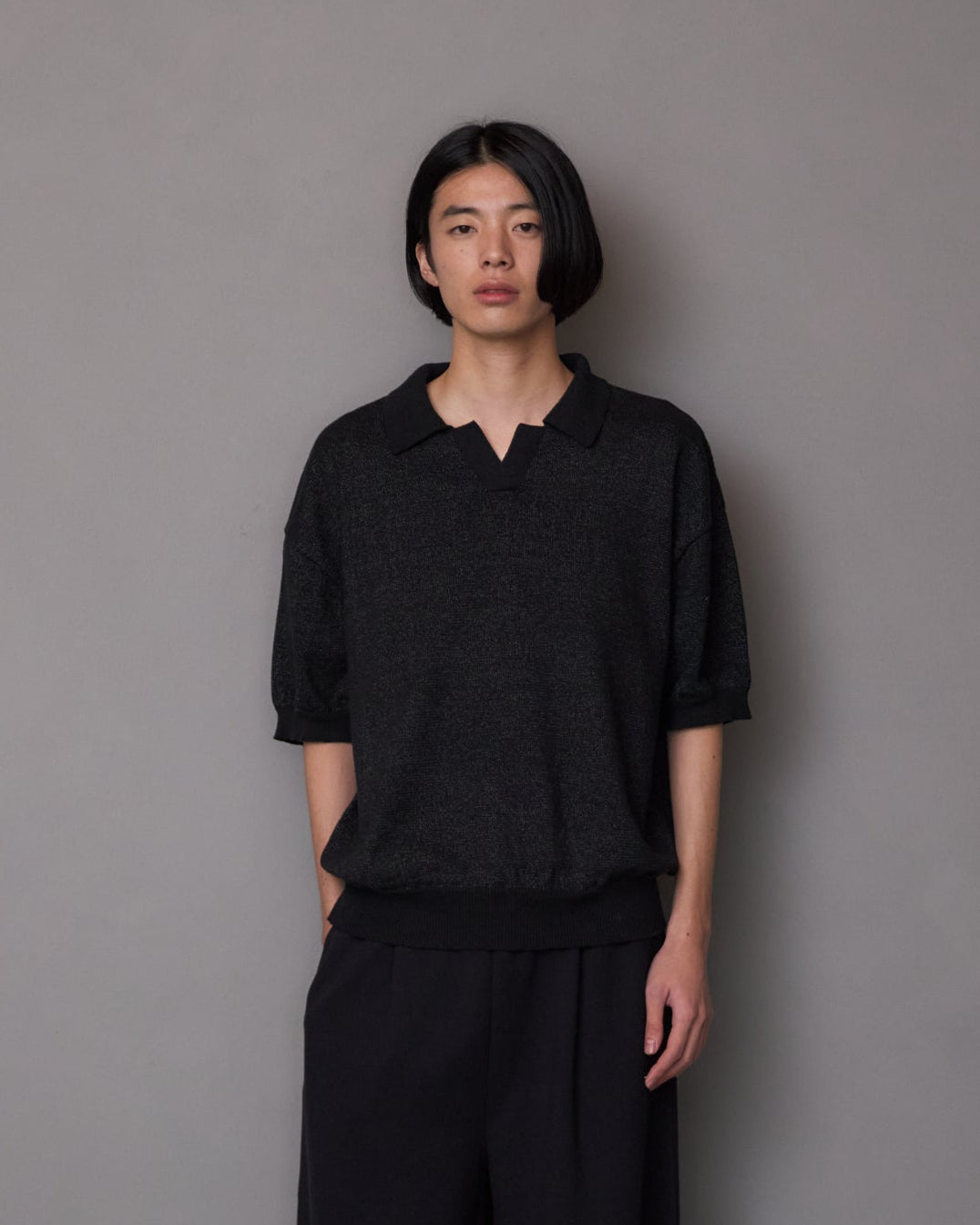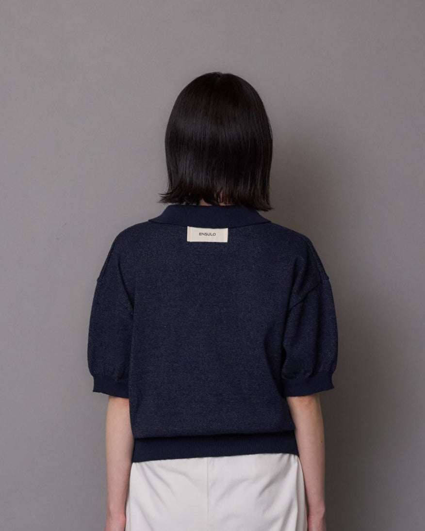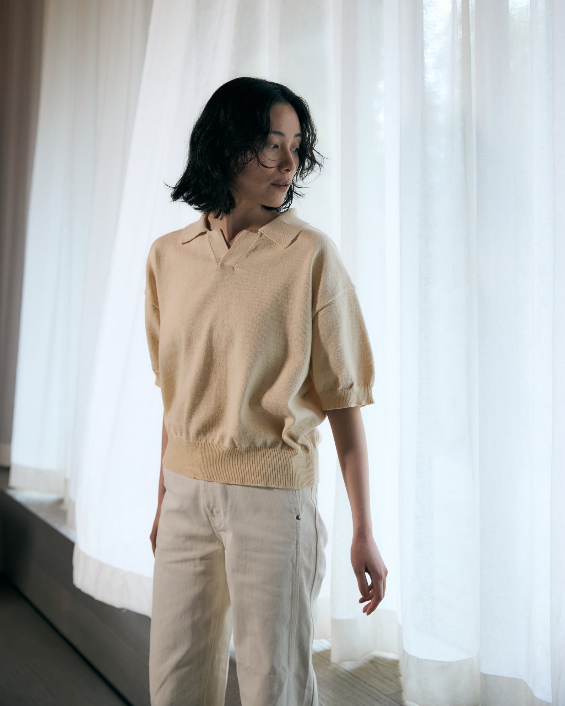 This skipper-style knit polo creates a subtle openness at the neckline, striking a refined balance between ease and understated elegance. Designed with a slightly cropped length, it offers proportionate balance when styled, while the wider body and short sleeves gently soften and complement the silhouette. The collar has been carefully considered in both size and shape to ensure it frames the face beautifully when worn. Embracing the raw, textured character unique to slub yarn, this knit polo blends effortlessly into a relaxed yet elevated adult casual wardrobe.